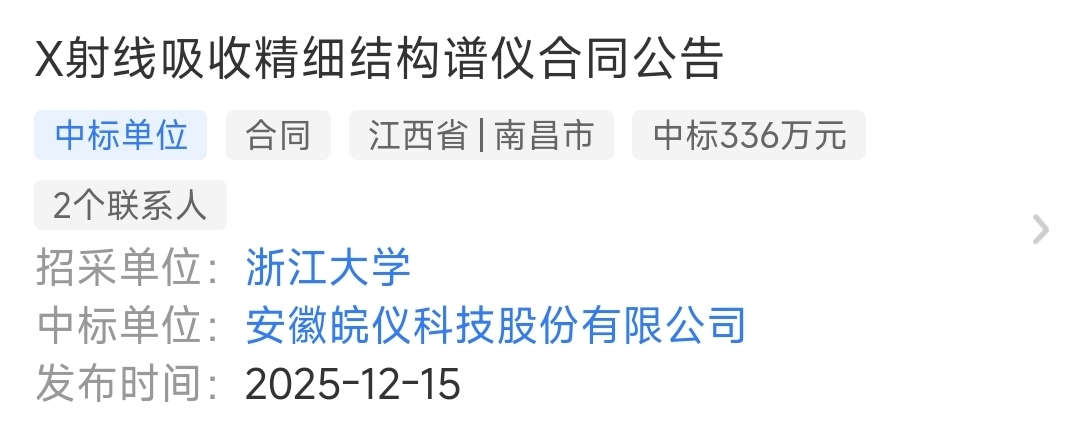 $皖仪科技(SH688600)$ 自主创新能力提升的体现,中标浙江大学单台336万的X射线吸收精细结构谱仪合同公告