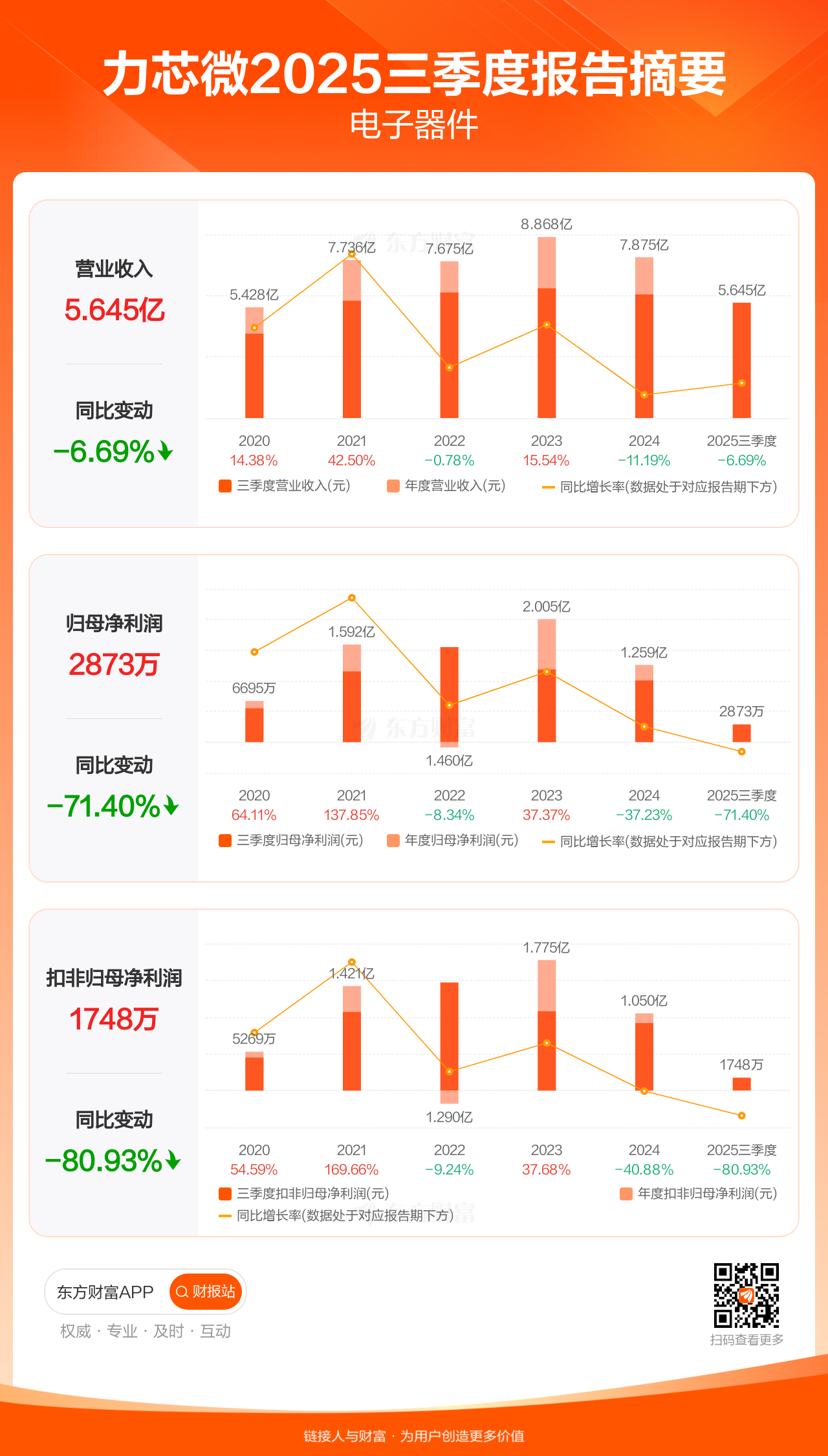 力芯微10月30日发布2025年三季报显示,公司前三季实现营业收入5.64亿元,同比下滑6.69%;归母净利润2873.43万元,同比下滑71.40%;扣非归母净利润1748.42万元,同比下滑80.93%。