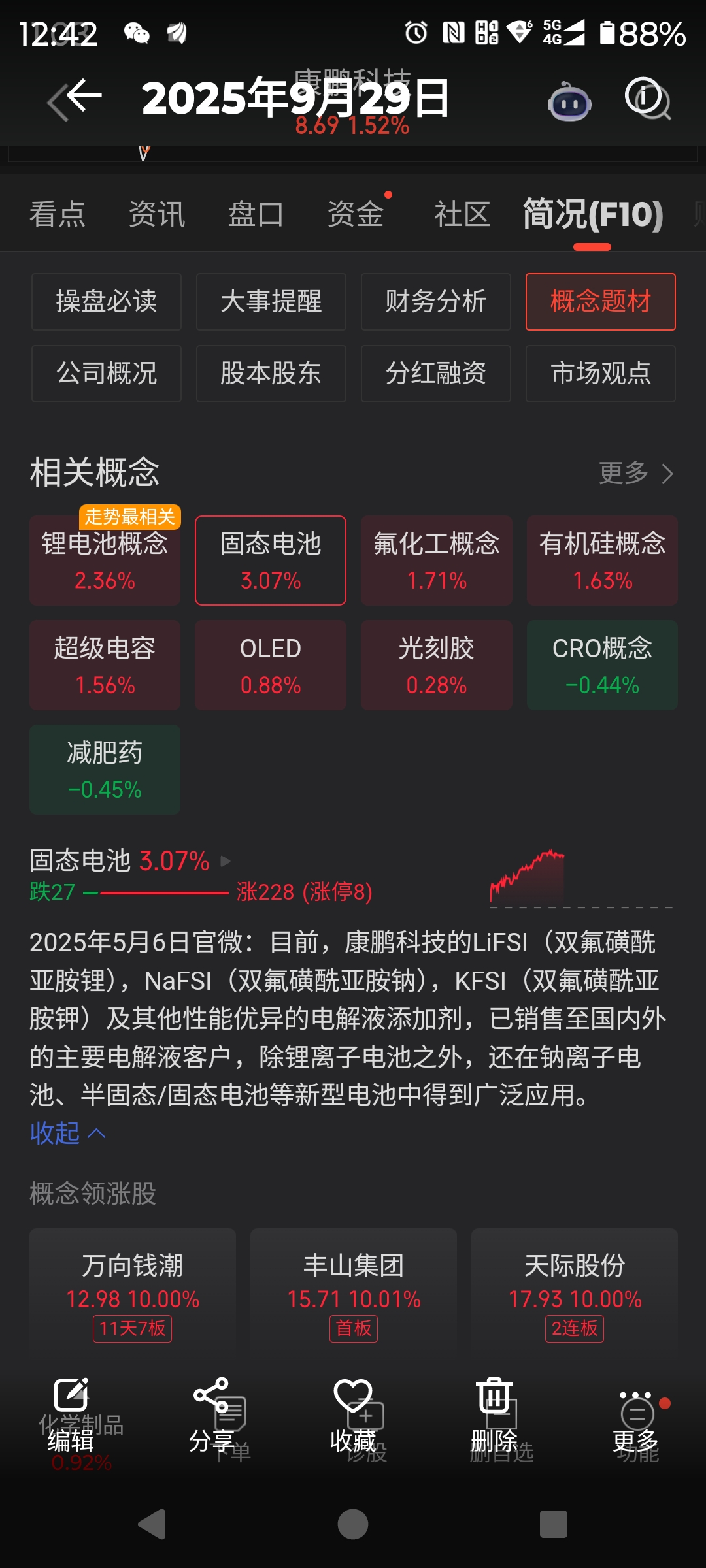$康鹏科技(SH688602)$ 今天发现一只,固态电池、锂电池和光刻胶于一身的前沿高科技股,科创板的688602康鹏科技,现价才8.72,价值严重低估!有可能反转向上大涨态势,密切关注中,已买入部分做为底仓!同花顺有标他是固态电池,这边没标!