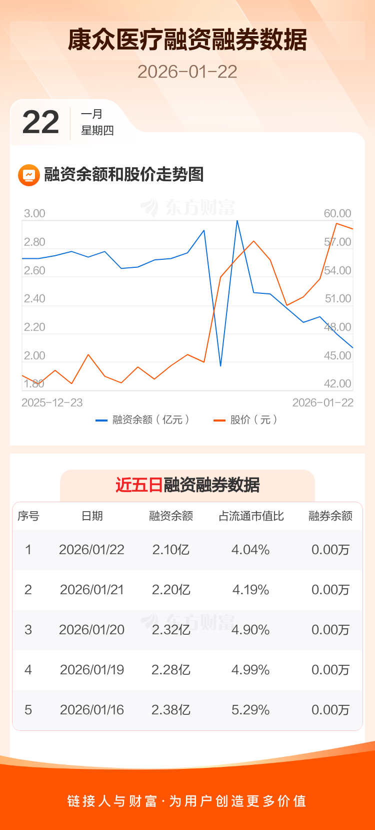 交易所最新数据显示,康众医疗于2026年1月22日获融资买入3118.62万元,融资偿还4297.33万元,当日融资净偿还1178.71万元。目前,该股融资余额2.10亿,占流通市值比例为4.04%。