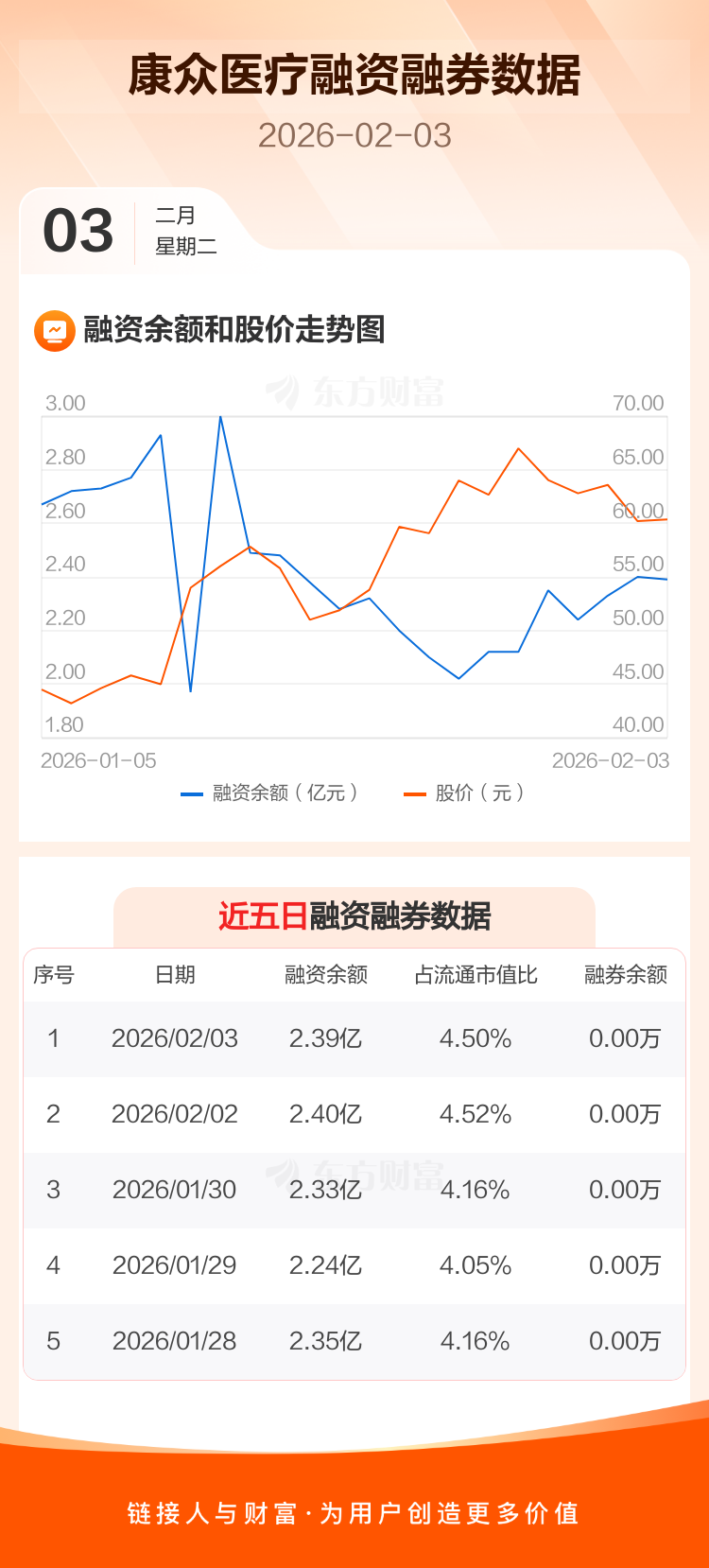 交易所最新数据显示,康众医疗于2026年2月3日获融资买入2049.75万元,融资偿还2103.54万元,当日融资净偿还53.79万元。目前,该股融资余额2.39亿,占流通市值比例为4.50%。