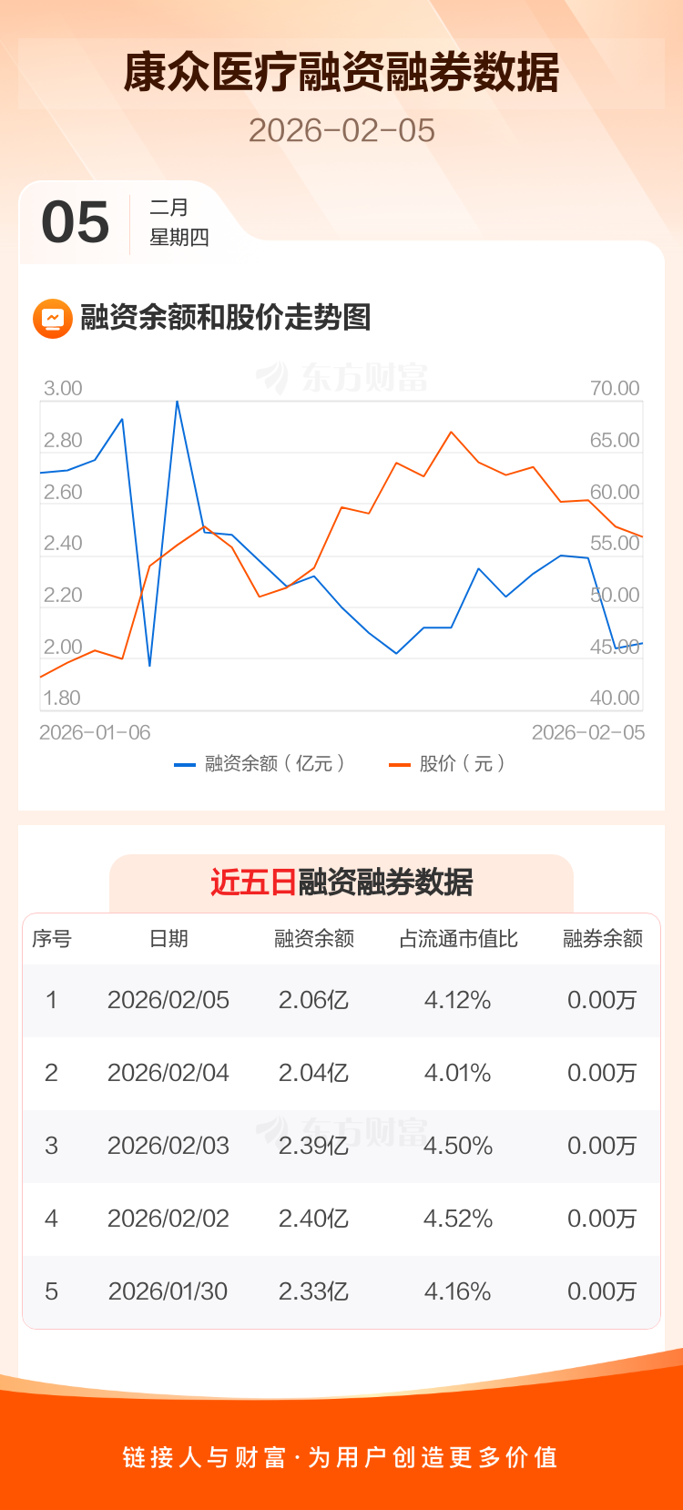 交易所最新数据显示,康众医疗于2026年2月5日获融资买入1195.90万元,融资偿还1023.58万元,当日融资净买入172.32万元。目前,该股融资余额2.06亿,占流通市值比例为4.12%。
