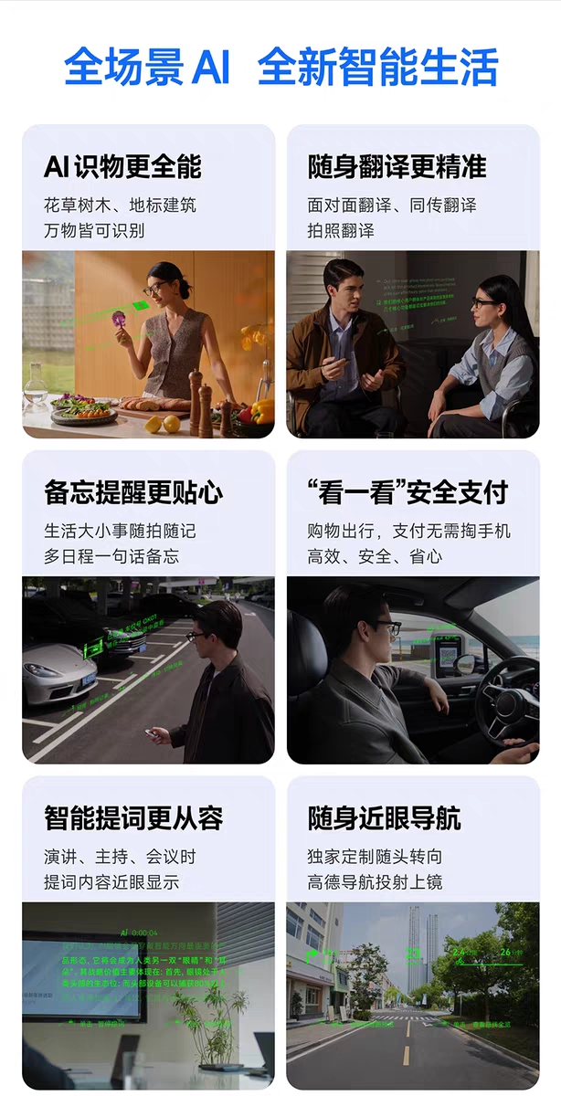 眼镜支持高德近眼导航系统,能在用户视野中直接投射路线指引;支付宝“看一看”支付功能允许用户通过凝视商品完成支付验证;