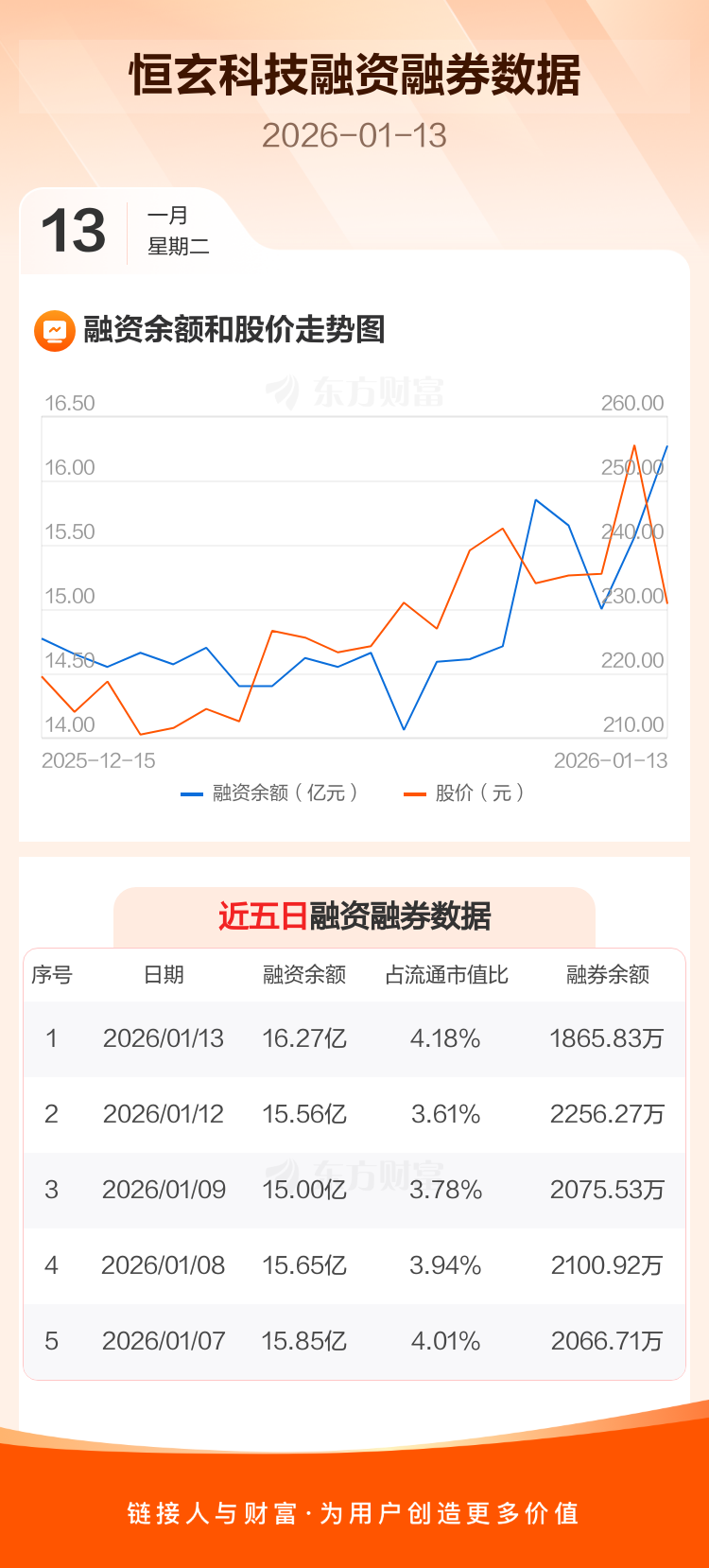 交易所最新数据显示,恒玄科技于2026年1月13日获融资买入3.72亿元,融资偿还3.02亿元,当日融资净买入7064.24万元。目前,该股融资余额16.27亿,占流通市值比例为4.18%。