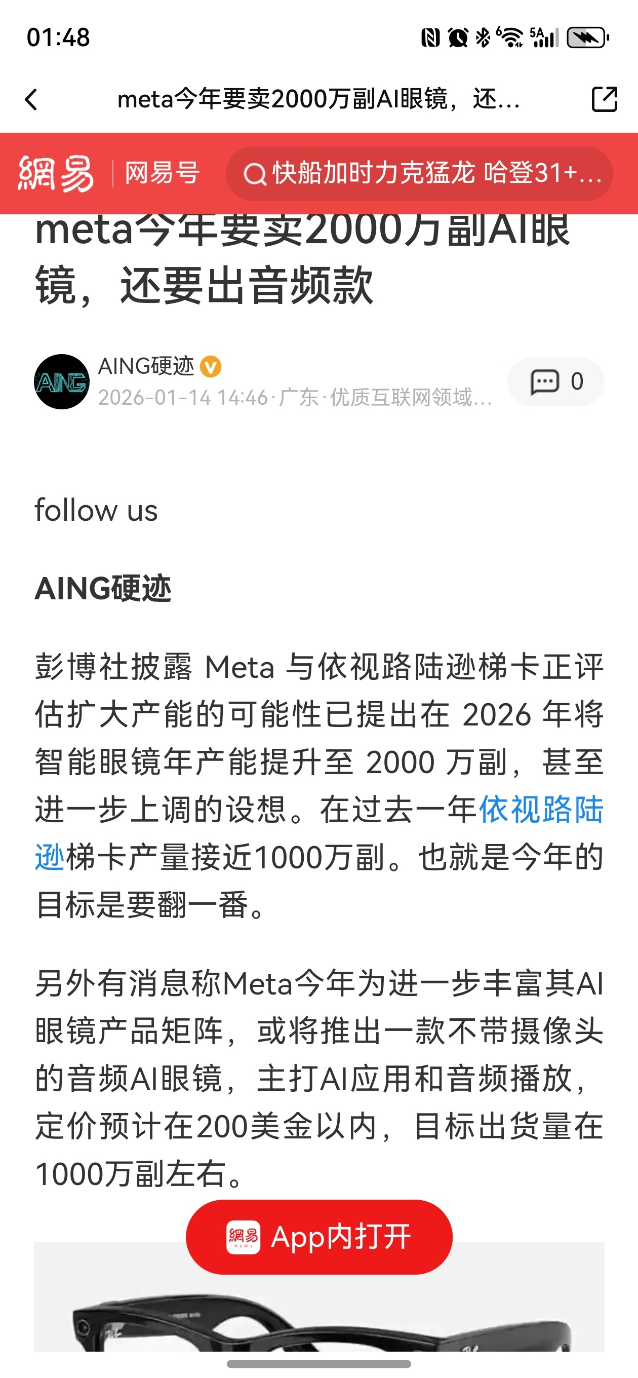 刚看到有小作文说,meta今年要出一款无显示无摄像头的音频眼镜,价格100美元左右。这样的话芯片肯定不会用高通AR1,说大概率会用10美元左右的恒玄2800。有知道消息的朋友吗?