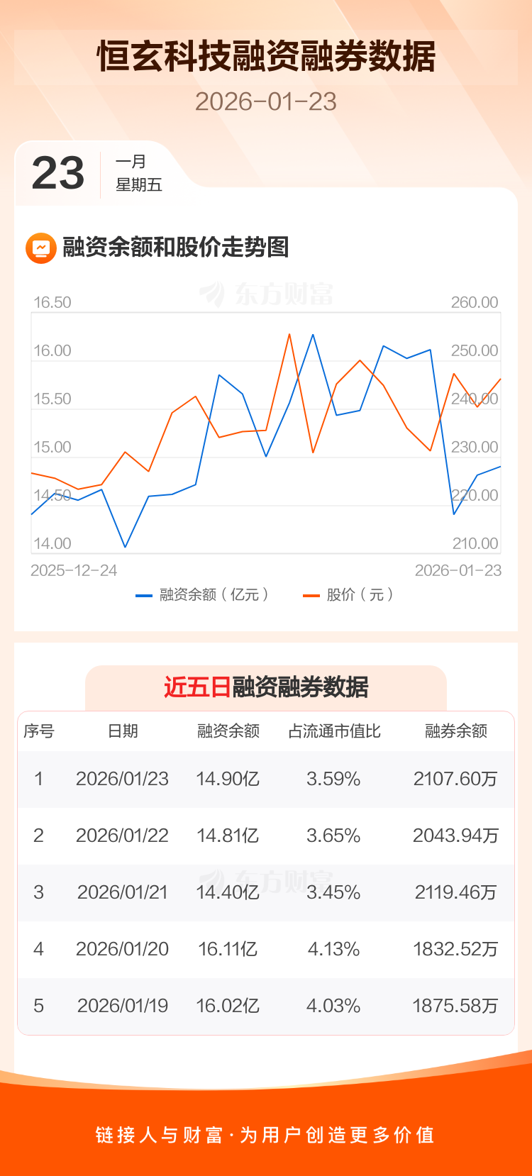 交易所最新数据显示,恒玄科技于2026年1月23日获融资买入1.43亿元,融资偿还1.34亿元,当日融资净买入952.57万元。目前,该股融资余额14.90亿,占流通市值比例为3.59%。