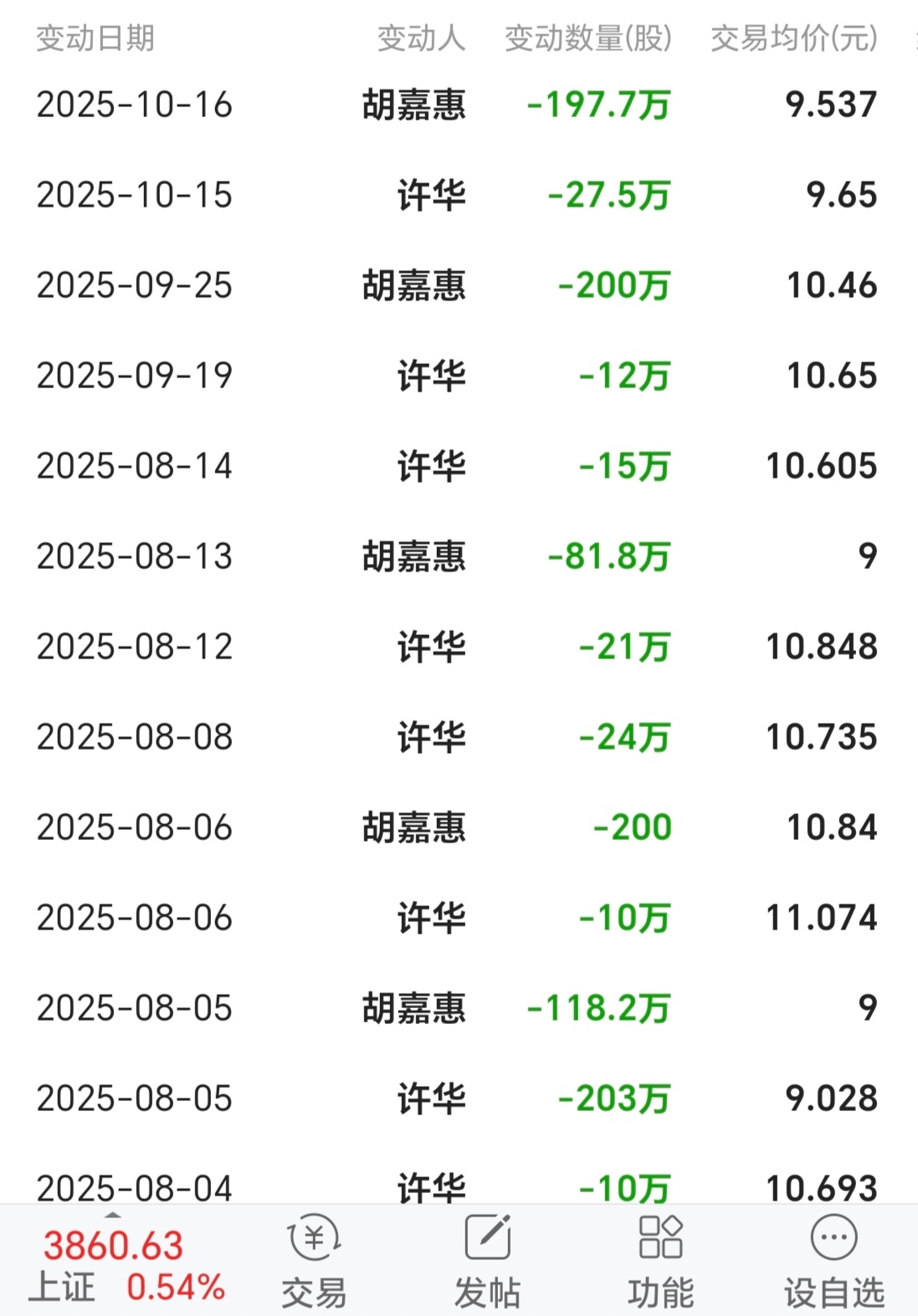 许华大约还有40万股,其它减完