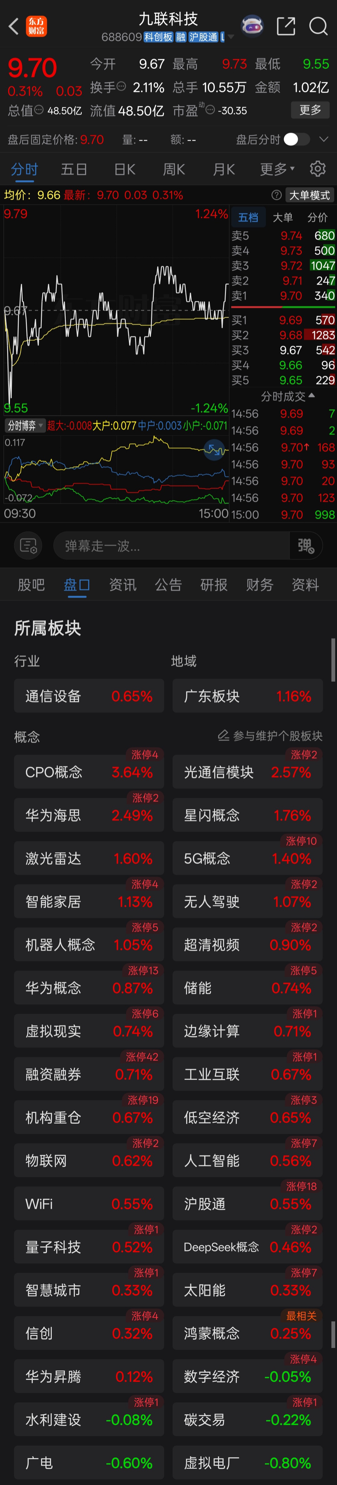 九联科技688609假的广东板块假的通信设备假的CPO概念光通信模块假的5G概念