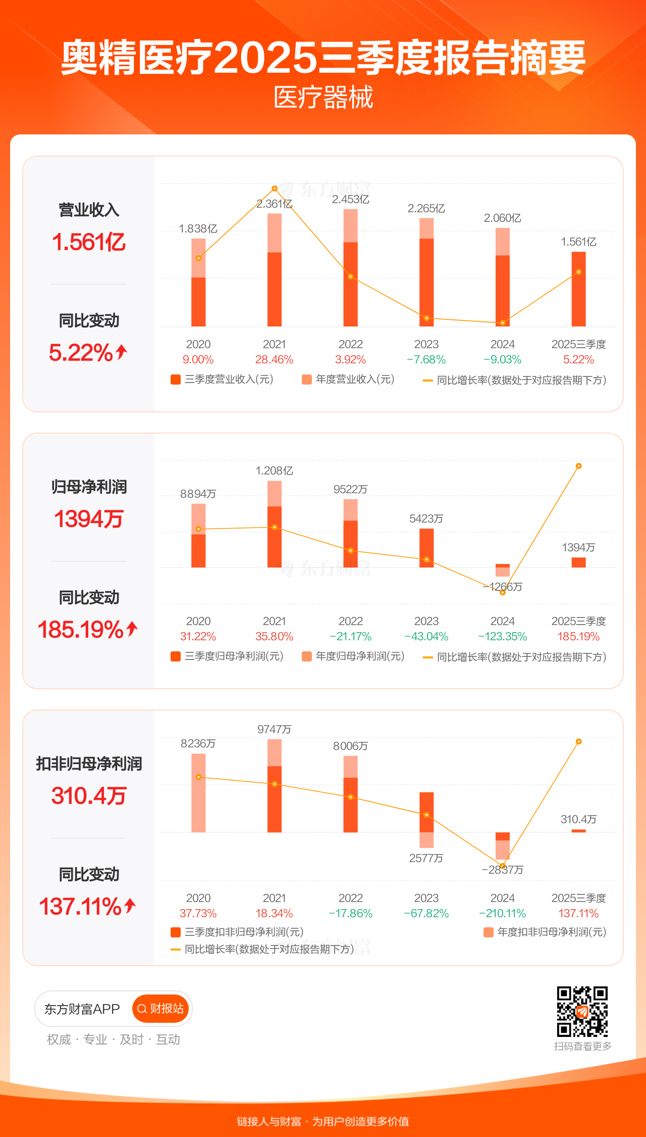 奥精医疗10月30日发布2025年三季报显示,公司前三季实现营业收入1.56亿元,同比增长5.22%;归母净利润1394.06万元,同比增长185.19%;扣非归母净利润310.45万元,同比增长137.11%。