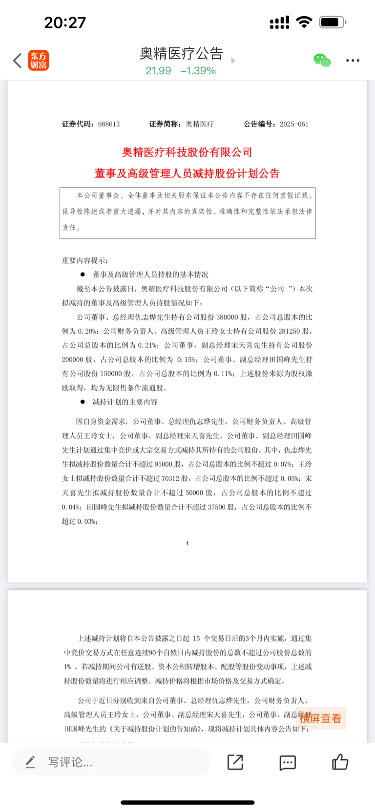$奥精医疗(SH688613)$ 发了一堆公告,真正有用的就是董监高都开始减持跑路了!
