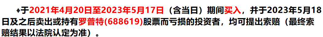 凡于2021年4月20日至2023年5月17日(含当日)期间买入,并于2023年5月18日及之后卖出或持有罗普特(688619)股票而亏损的投资者,均可提出挽损