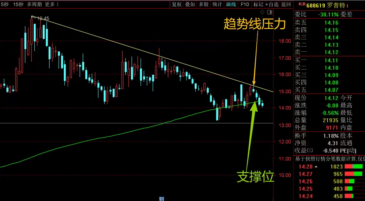 $罗普特(SH688619)$ 近期走势相对弱一些,主要是前期高位回落下来,没有明显的反弹走势,反而是高点不断降低,最近几周都在大均线位置附近震荡折腾,接下来重点看大均线14.43的得失,能稳住都好说,有效跌破就要防着破位风险了,大幅控制仓位优先,等走稳了再考虑回补。