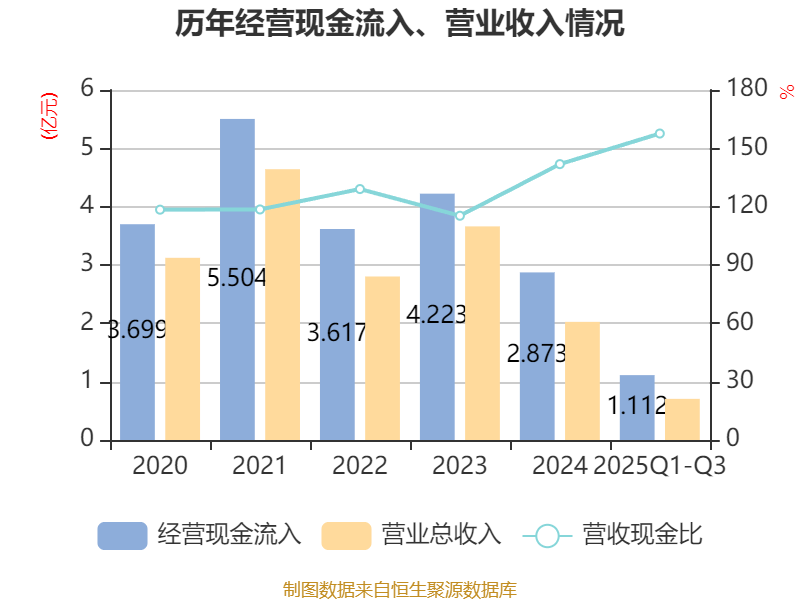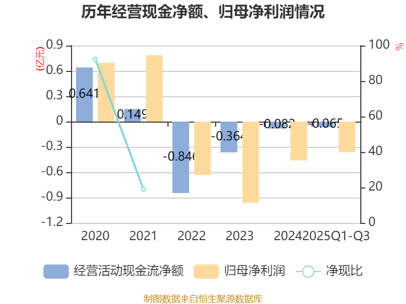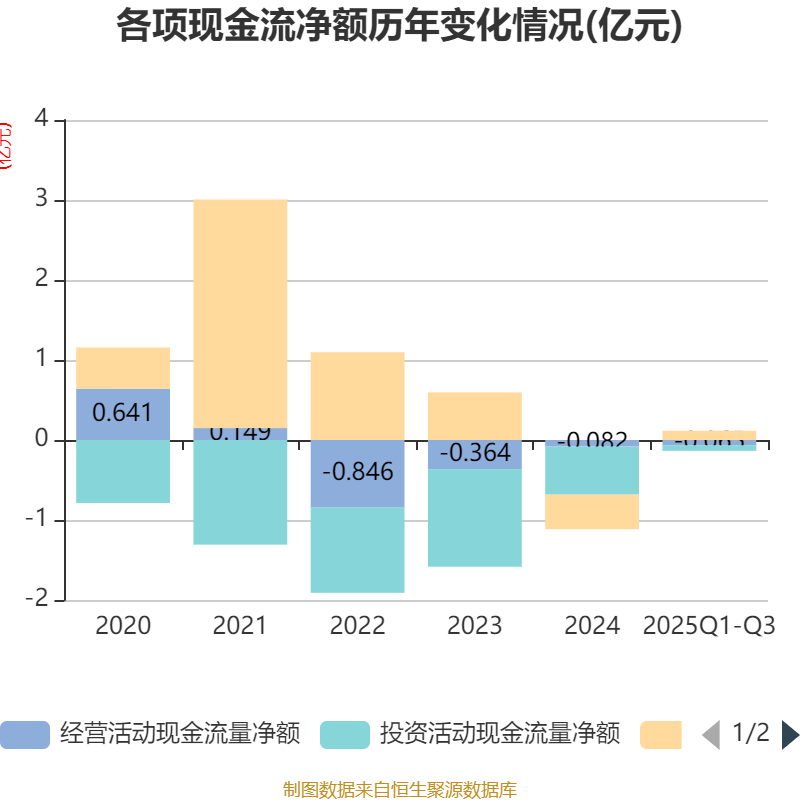 2025年前三季度,公司经营活动现金流净额为-645.74万元,同比增加1830.05万元;筹资活动现金流净额1150.24万元,同比增加1569.47万元;投资活动现金流净额-703万元,上年同期为-5409.91万元。