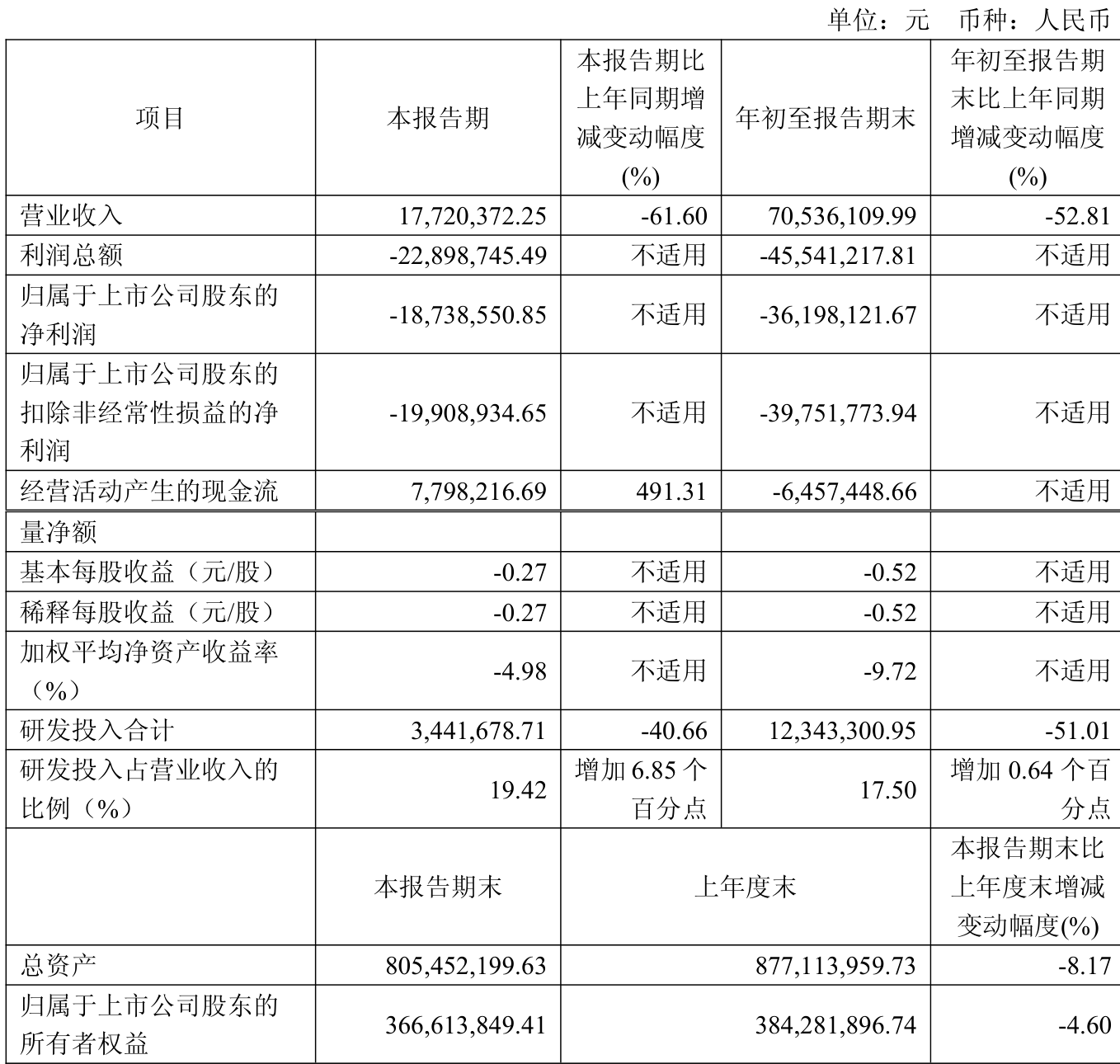中证智能财讯禾信仪器(688622)10月30日披露2025年第三季度报告。前三季度公司实现营业总收入7053.61万元,同比下降52.81%;归母净利润亏损3619.81万元,上年同期亏损2215.28万元;扣非净利润亏损3975.18万元,上年同期亏损3338.99万元;经营活动产生的现金流量净额为-645.74万元,上年同期为-2475.79万元;报告期内,禾信仪器基本每股收益为-0.52元,加权平均净资产收益率为-9.72%。