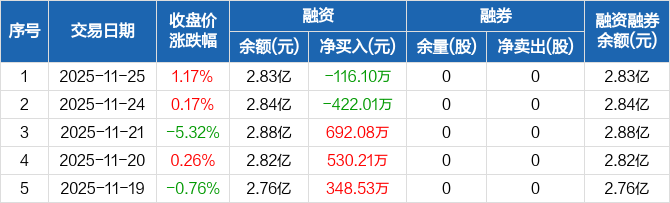 呈和科技:融资净偿还116.1万元,融资余额2.83亿元(11-25)