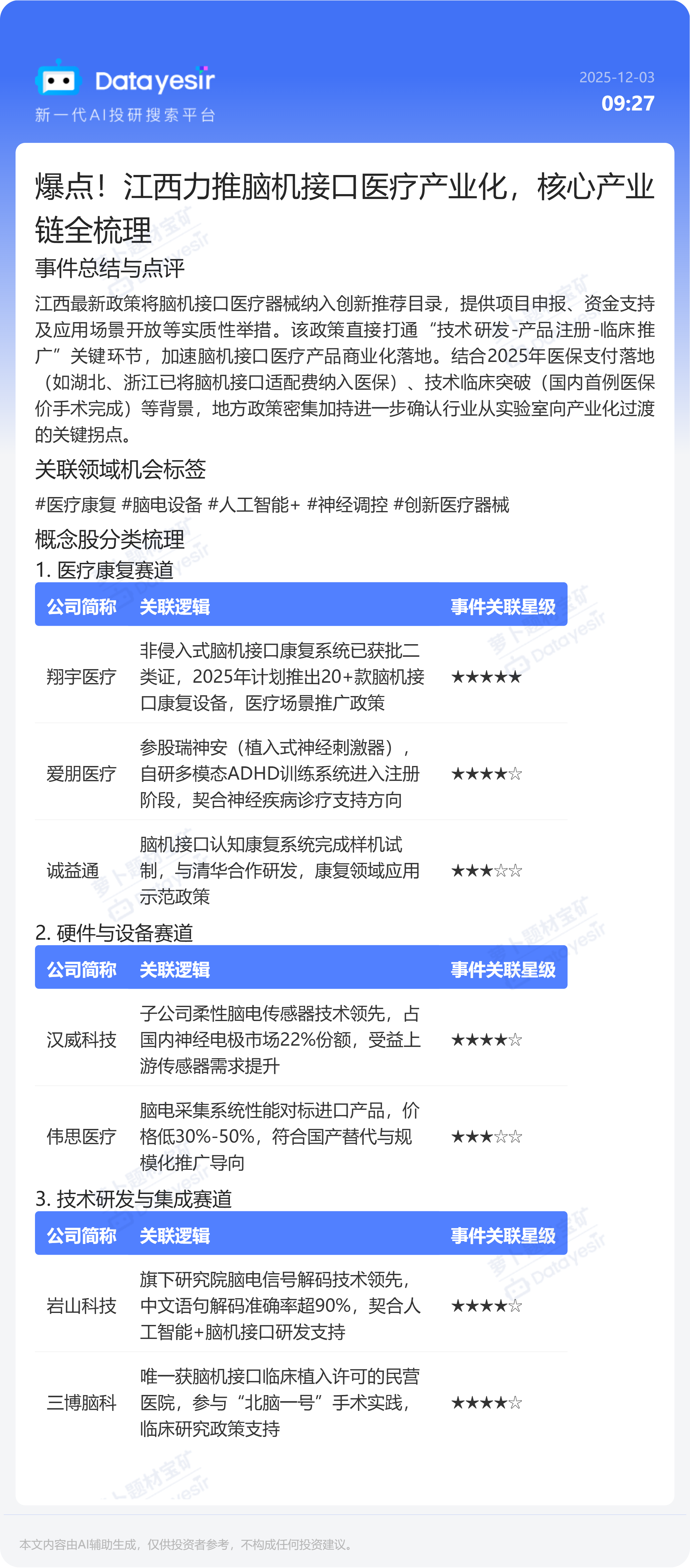 江西最新政策将脑机接口医疗器械纳入创新推荐目录,提供项目申报、资金支持及应用场景开放等实质性举措。该政策直接打通“技术研发-产品注册-临床推广”关键环节,加速脑机接口医疗产品商业化落地。
