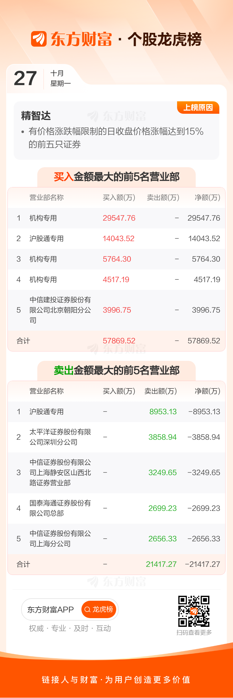 交易所2025年10月27日公布的交易公开信息显示,精智达因成为有价格涨跌幅限制的日收盘价格涨幅达到15%的前五只证券上榜。精智达当日收报190.28元,涨跌幅15.45%,偏离值15.45%,换手率10.25%,成交额13.36亿。