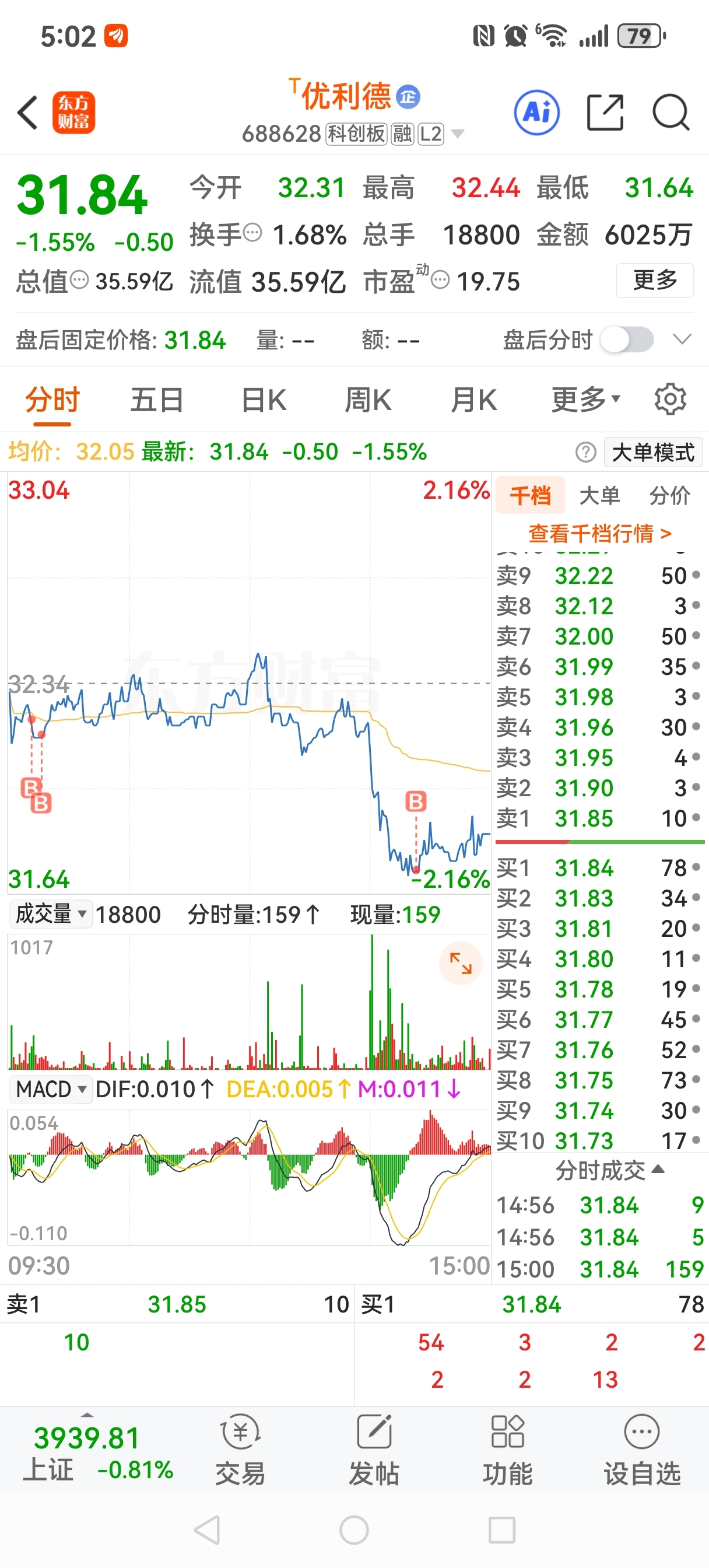 $优利德(SH688628)$ 砸盘机构它的买入成本31.03,资金成本1.5%(0.46/股),分红所得税0.13/股,杂税费 0.02元/股。综合31.64左右。是巧合吗?反正我31.7加了不少仓位