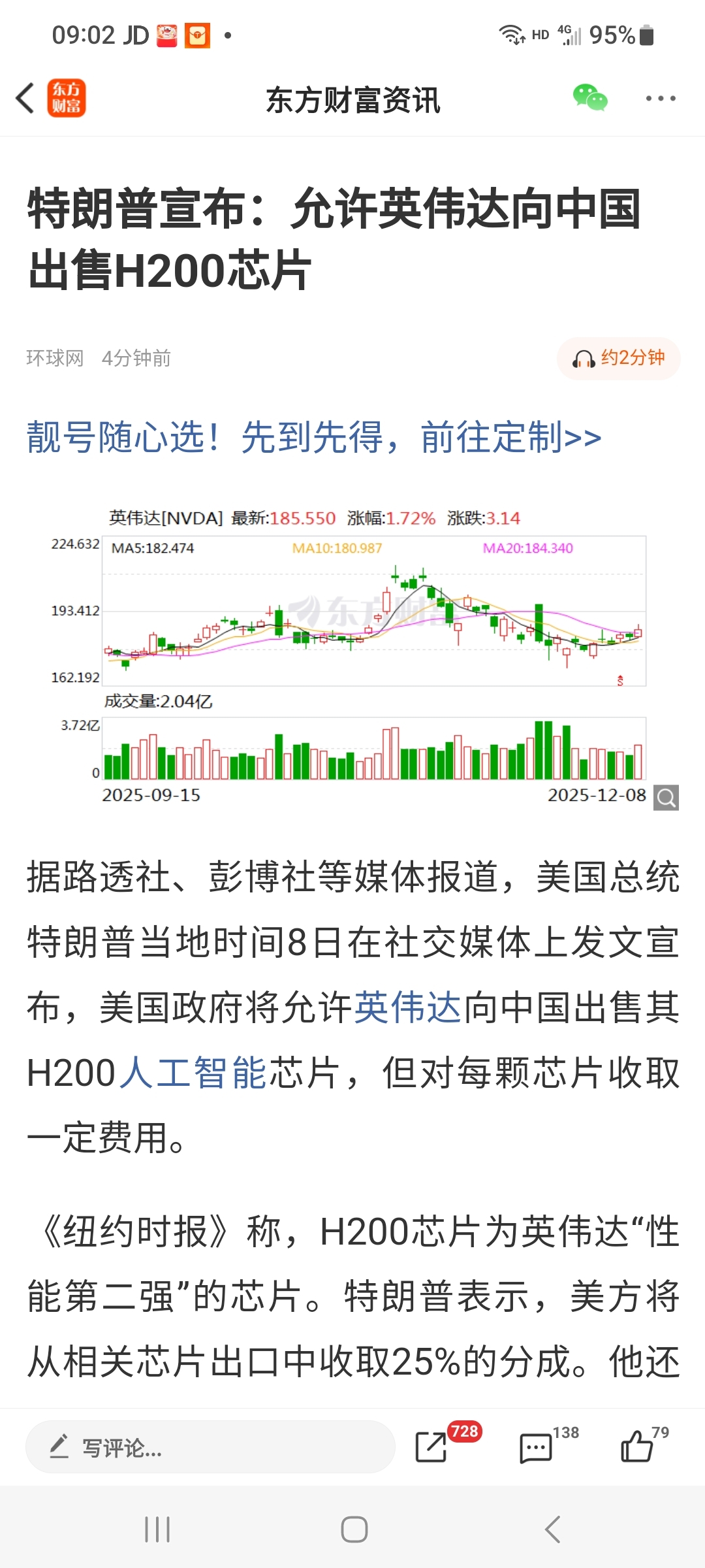 特朗普宣布:允许英伟达向中国出售H200芯片。