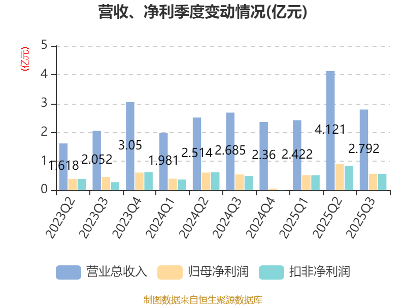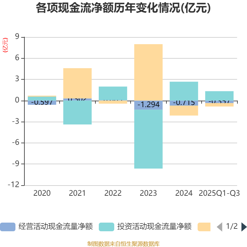 2025年前三季度,公司经营活动现金流净额为-3571.9万元,同比增加575.93万元;筹资活动现金流净额-4853.79万元,同比增加5652.86万元;投资活动现金流净额1.33亿元,上年同期为1.03亿元。