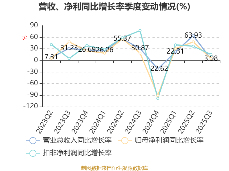 资产重大变化方面,截至2025年三季度末,公司货币资金较上年末减少51.43%,占公司总资产比重下降13.43个百分点;存货较上年末增加47.12%,占公司总资产比重上升7个百分点;交易性金融资产合计较上年末增加199.77%,占公司总资产比重上升6.33个百分点;一年内到期的非流动资产较上年末增加80.27%,占公司总资产比重上升2.07个百分点。