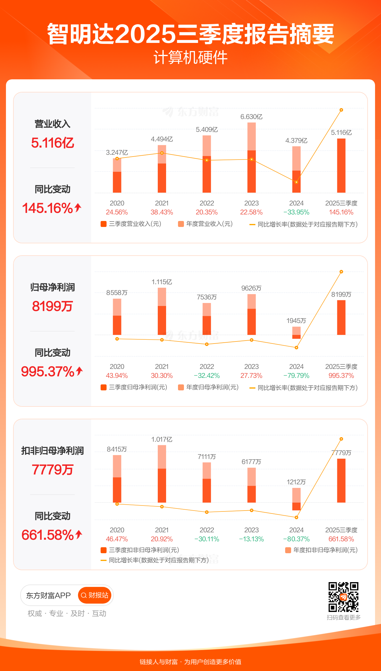 智明达10月24日发布2025年三季报显示,公司前三季实现营业收入5.12亿元,同比增长145.16%;归母净利润8198.71万元,同比增长995.37%;扣非归母净利润7778.56万元,同比增长661.58%。