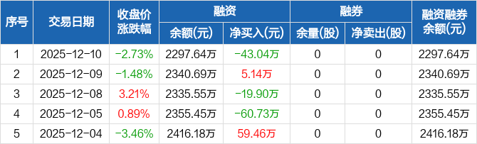 誉辰智能:融资净偿还43.04万元,融资余额2297.64万元(12-10)