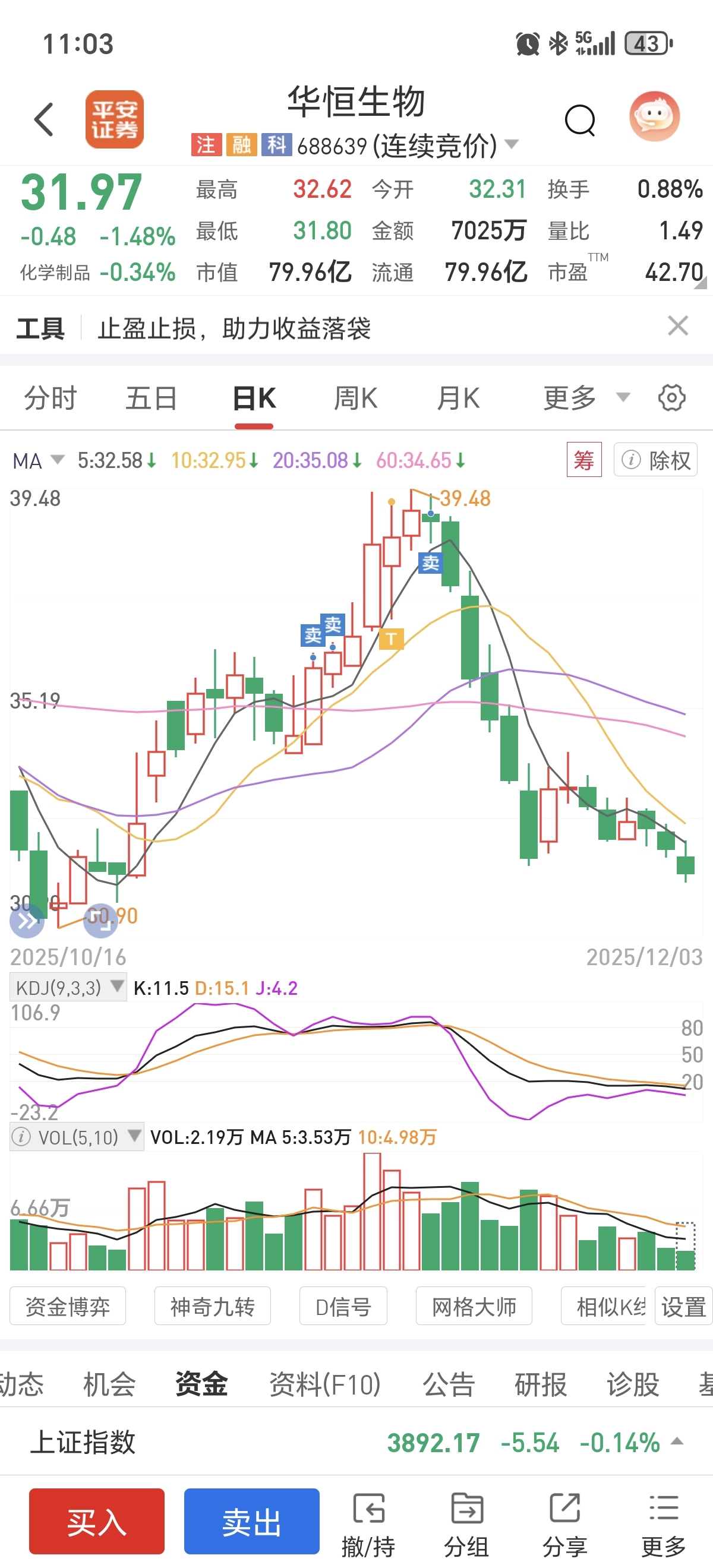 $华恒生物(SH688639)$ 以为卖错了,回头一看卖在近期的最高点,30可入点了