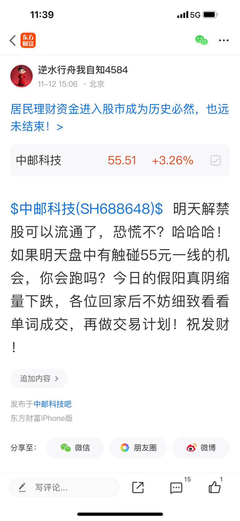 $中邮科技(SH688648)$ 昨天说今天有触碰55元一线的机会,你会跑吗?不知道各位做了什么样的选择。早盘高点受制于半年线价位,下午先看能否带量有效突破吧,如果能,还可继续看高一点,则是很多朋友期许的20日价位,别着急,一步一步来!但若没有突破呢?各位想好了如何应对了吗?祝一切安好!
