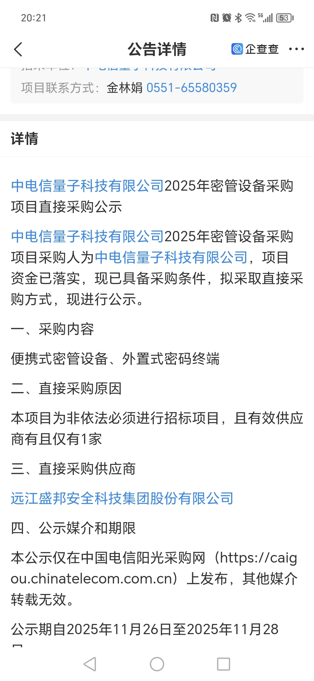 中标中电信量子科技有限公司,且有效供应商有且仅有1家直接采购