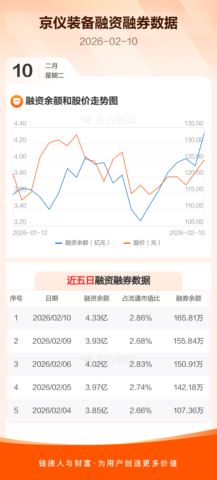交易所最新数据显示,京仪装备于2026年2月10日获融资买入1.18亿元,融资偿还7804.10万元,当日融资净买入3983.91万元。目前,该股融资余额4.33亿,占流通市值比例为2.86%。