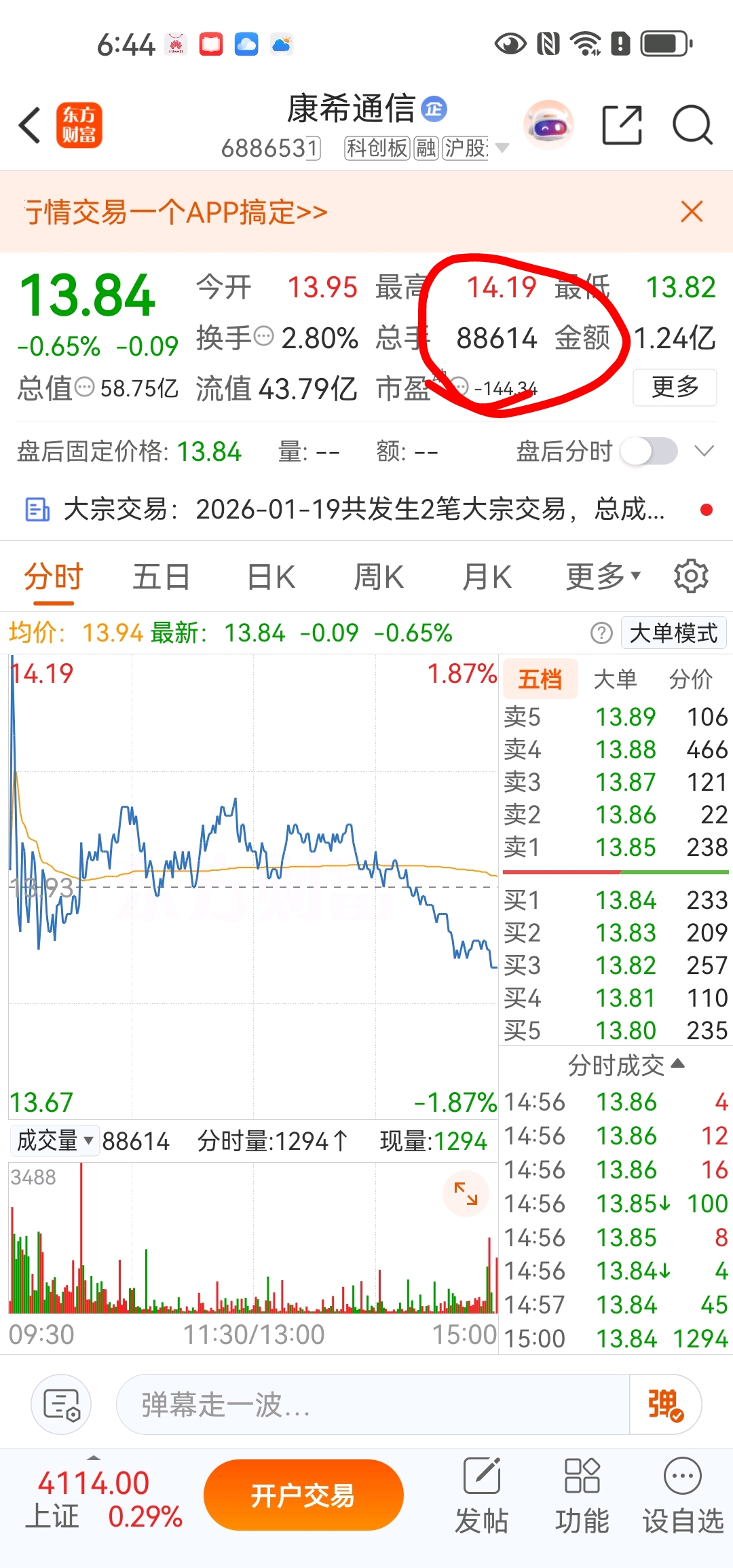 $康希通信(SH688653)$ 88618,今天成交量。拜拜了要!