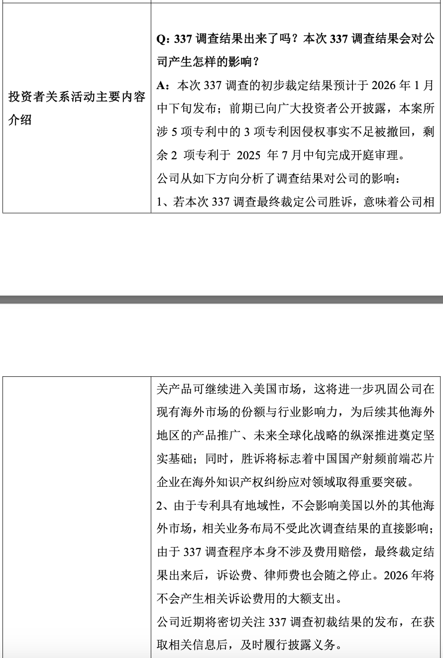 2026年1月24日(北京时间),公司获悉ITC行政法官初步裁决结果,公司子公司康希通信科技(上海)有限公司、GRAND CHIP LABS,INC.和相关企业未违反《美国1930年关税法》第337节的规定,不存在侵犯Skyworks US 9,917,563和US 8,717,101两项专利之专利权。