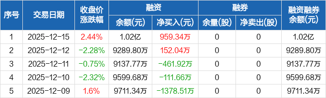 融资方面,当日融资买入1553.23万元,融资偿还593.89万元,融资净买入959.34万元。融券方面,融券卖出0股,融券偿还0股,融券余量0股,融券余额0元。融资融券余额合计1.02亿元。