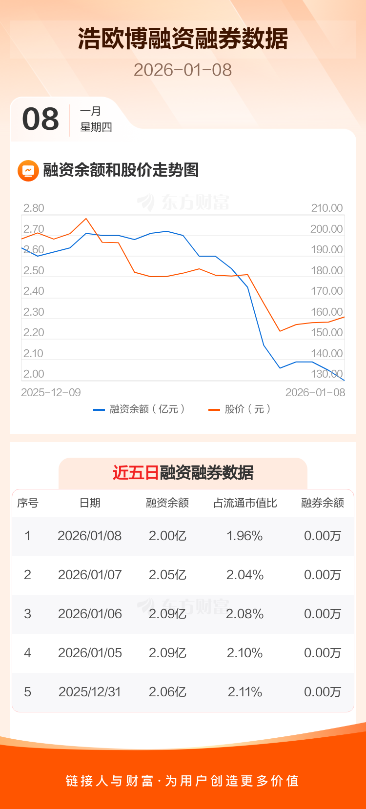 交易所最新数据显示,浩欧博于2026年1月8日获融资买入1170.80万元,融资偿还1656.25万元,当日融资净偿还485.45万元。目前,该股融资余额2.00亿,占流通市值比例为1.96%。