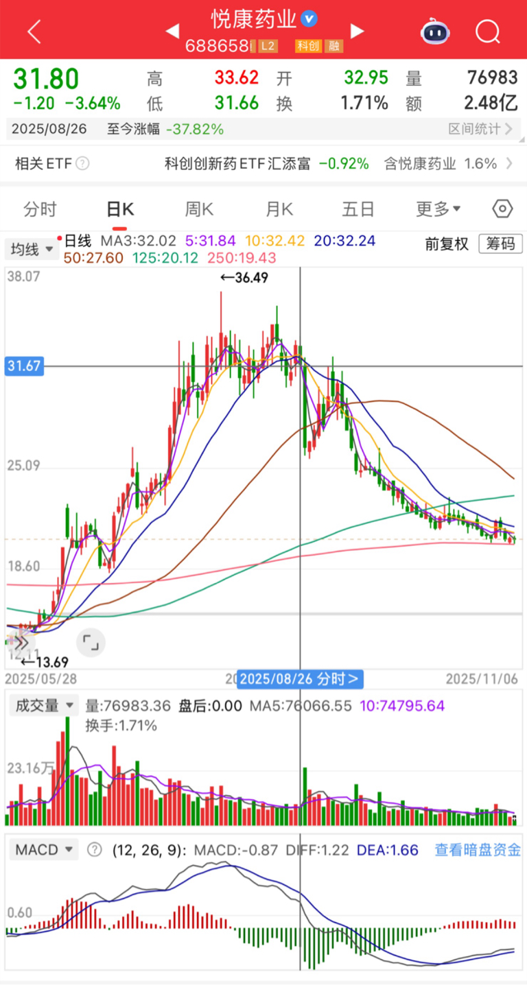 下跌可以说是从2025年8月26日注射用羟基红花黄色素A进入到补充资料序列那天,股价也正好做完顶部形态。