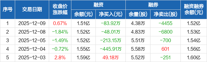 融资方面,当日融资买入1072.12万元,融资偿还1156.04万元,融资净偿还83.92万元,连续4日净偿还累计790.98万元。融券方面,融券卖出2145股,融券偿还6600股,融券余量4.38万股,融券余额105.93万元。融资融券余额合计1.52亿元。