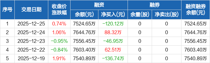 元琛科技:融资净偿还120.12万元,融资余额7524.65万元(12-25)