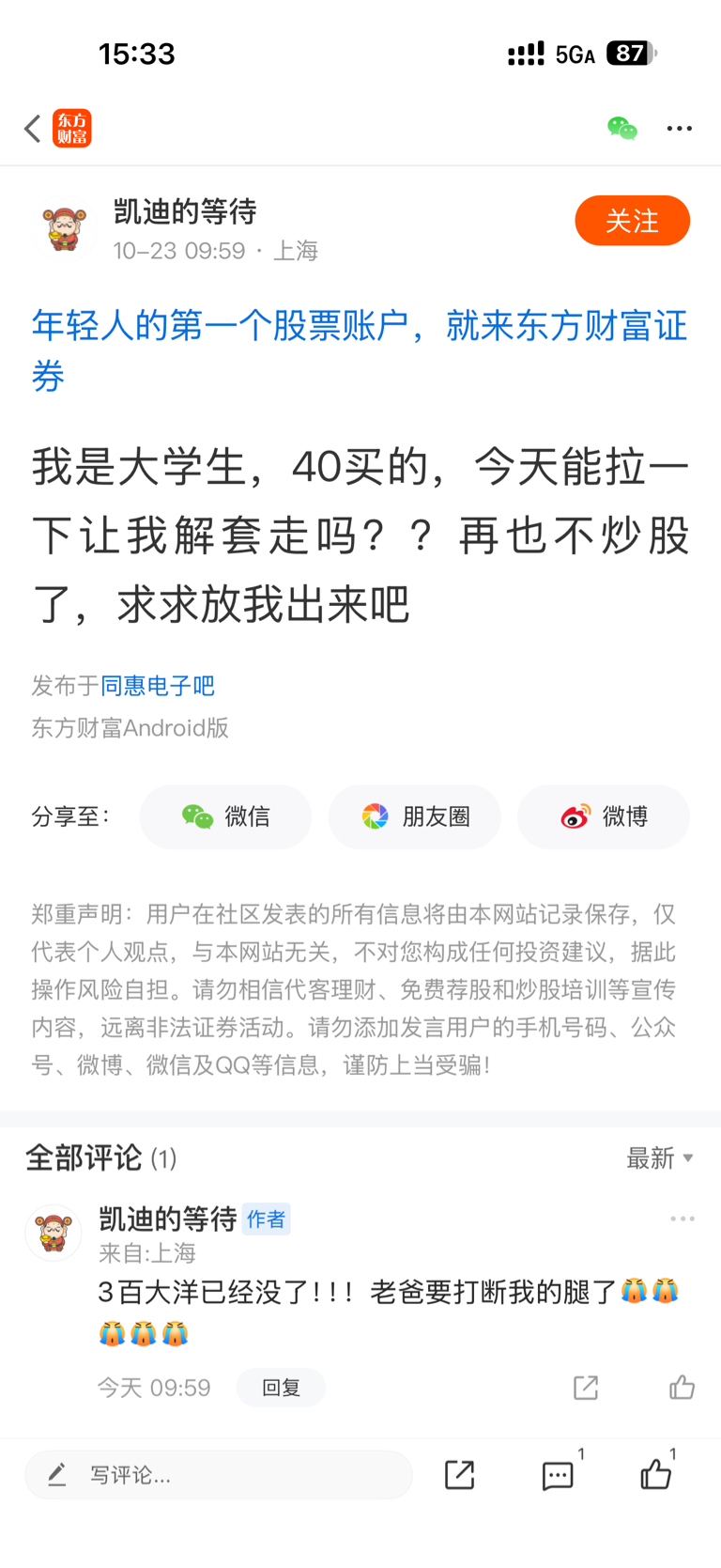 温馨提示: 1.根据《证券法》规定,禁止编造、传播虚假信息或者误导性信息,扰乱证券市场;2.用户在本社区发表的所有资料、言论等仅代表个人观点,与本网站立场无关,不对您构成任何投资建议。用户应基于自己的独立判断,自行决定证券投资并承担相应风险。《东方财富社区管理规定》