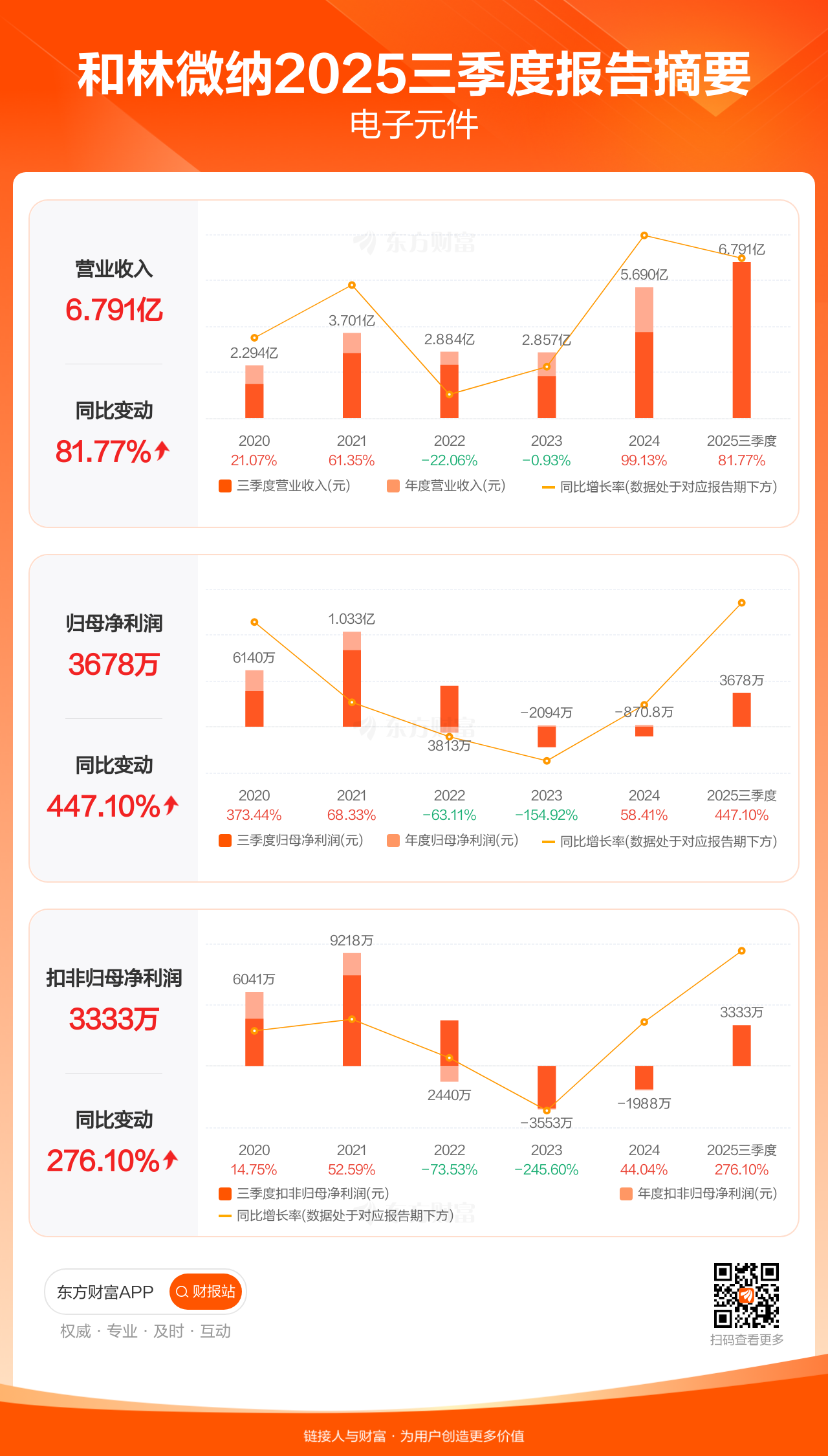 和林微纳10月30日发布2025年三季报显示,公司前三季实现营业收入6.79亿元,同比增长81.77%;归母净利润3677.99万元,同比增长447.10%;扣非归母净利润3332.96万元,同比增长276.10%。