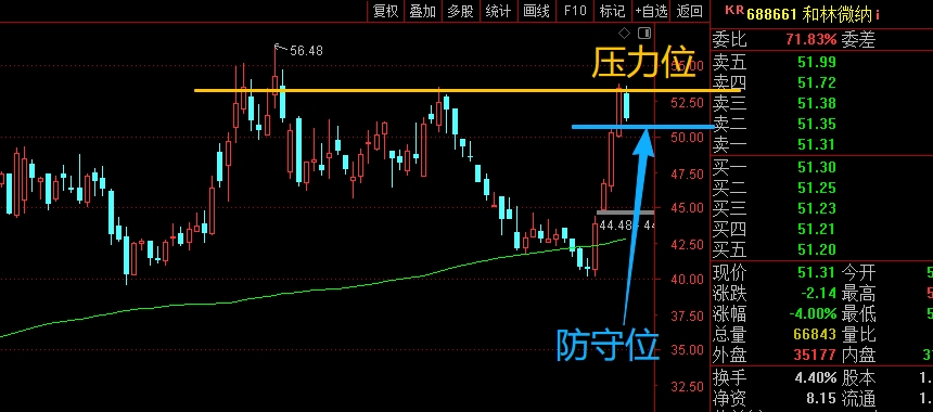 $和林微纳(SH688661)$ 近期反弹比较强势,连续中阳线拉升起来,今天高位小调整,接下来重点看脚底蓝色横线位置的支撑情况,能稳住就还行,继续震荡看涨冲击头上压力位,但有效跌破就要防着短线回落风险了,需要控制仓位应对。#炒股日记# #收盘点评#
