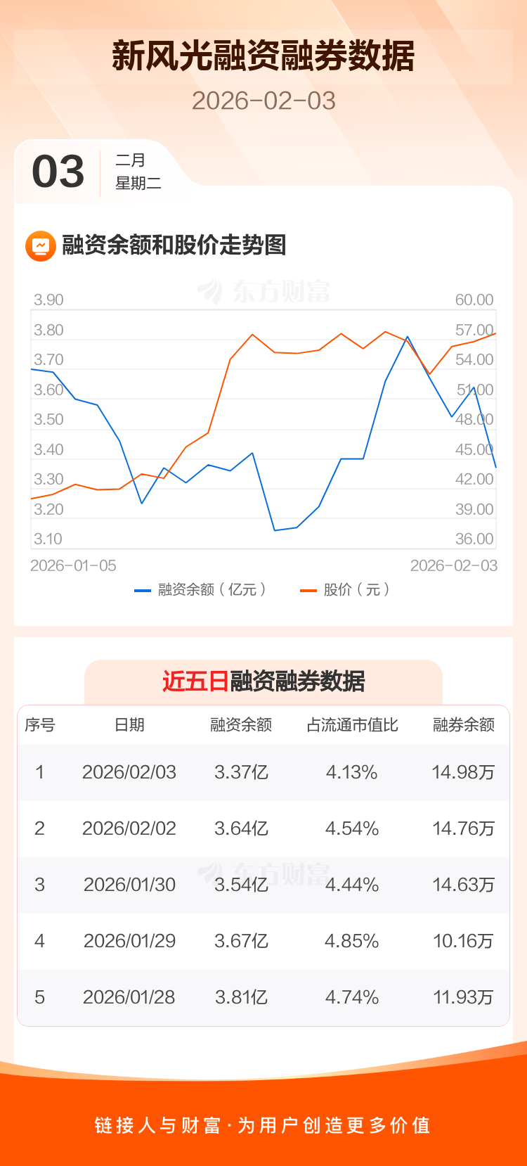 交易所最新数据显示,新风光于2026年2月3日获融资买入3207.32万元,融资偿还5956.68万元,当日融资净偿还2749.36万元。目前,该股融资余额3.37亿,占流通市值比例为4.13%。