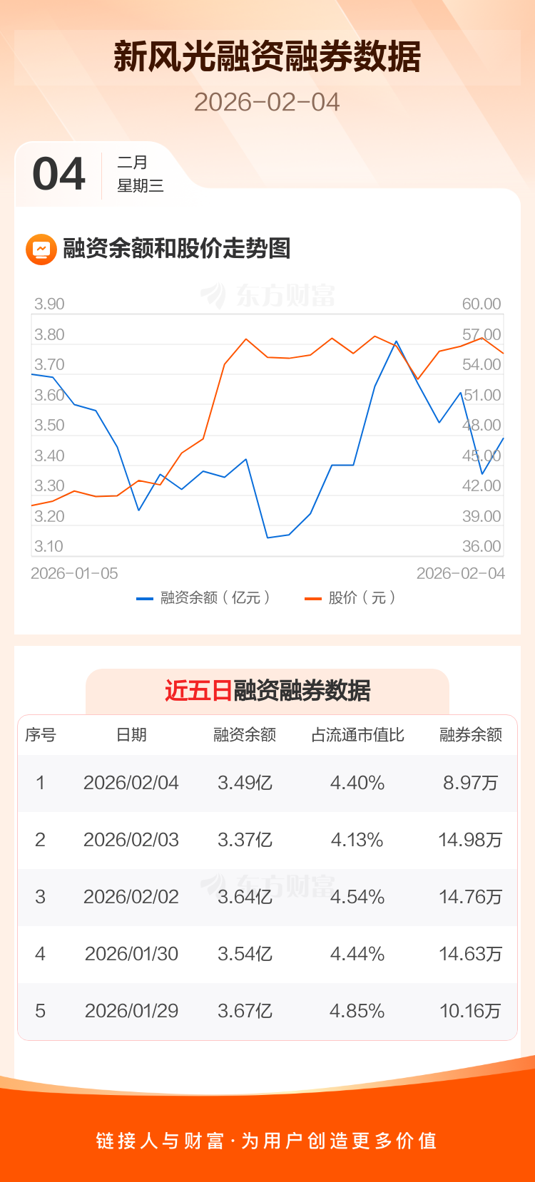 交易所最新数据显示,新风光于2026年2月4日获融资买入4589.90万元,融资偿还3358.06万元,当日融资净买入1231.84万元。目前,该股融资余额3.49亿,占流通市值比例为4.40%。