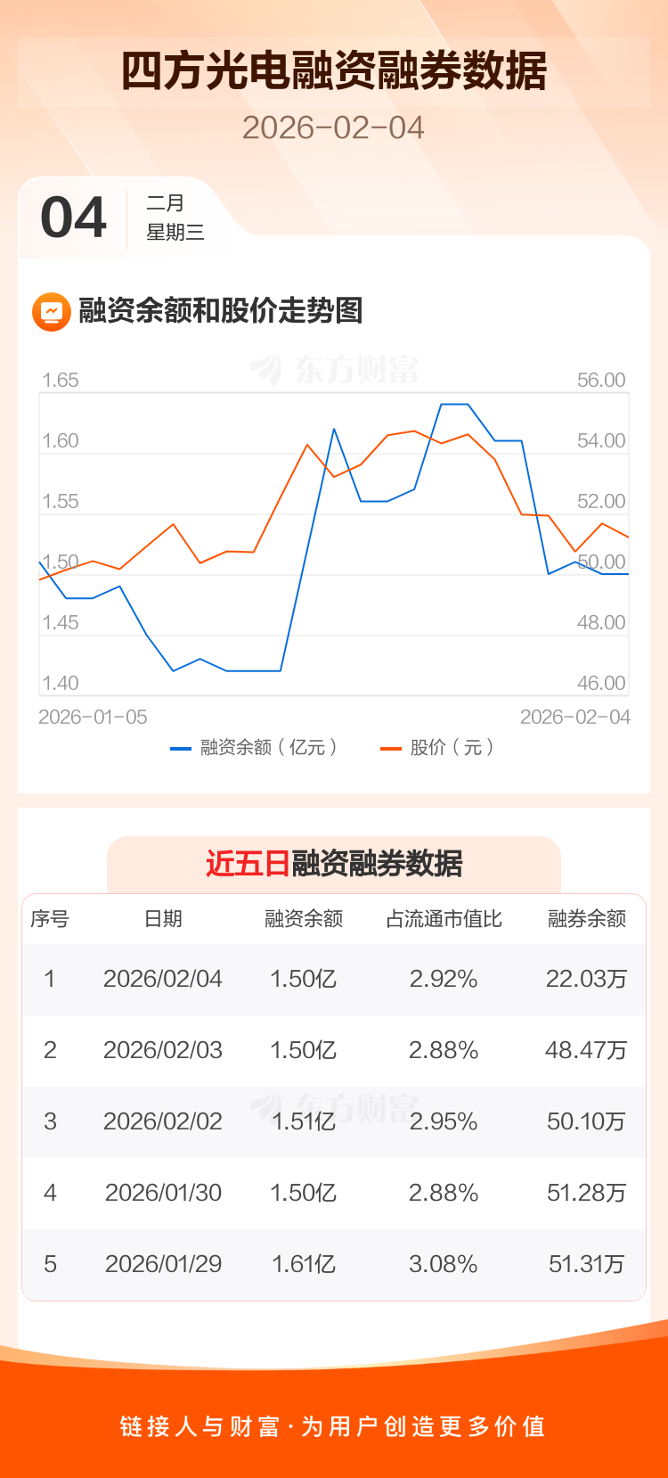 交易所最新数据显示,四方光电于2026年2月4日获融资买入461.32万元,融资偿还388.56万元,当日融资净买入72.76万元。目前,该股融资余额1.50亿,占流通市值比例为2.92%。
