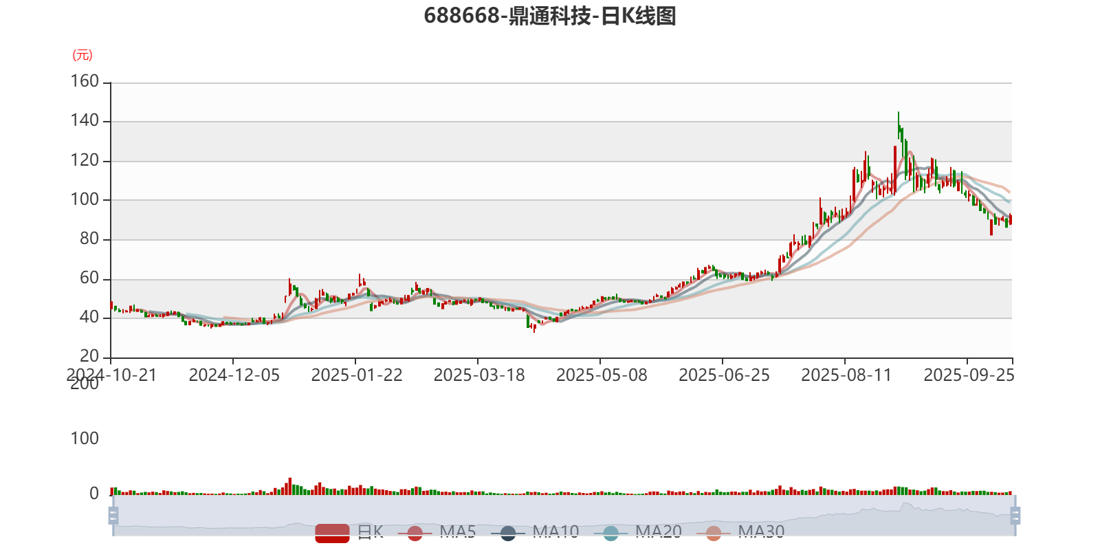 以10月20日收盘价计算,鼎通科技目前市盈率(TTM)约为61.52倍,市净率(LF)约6.75倍,市销率(TTM)约8.64倍。