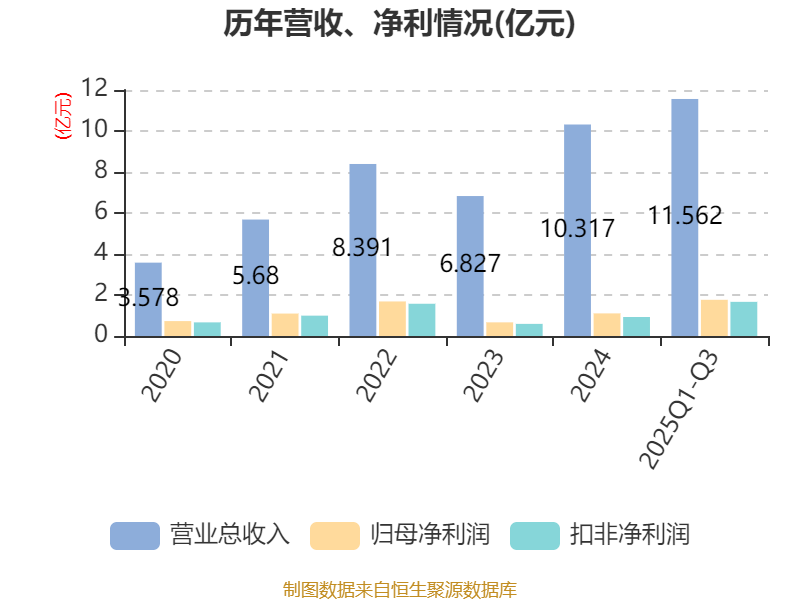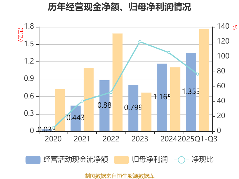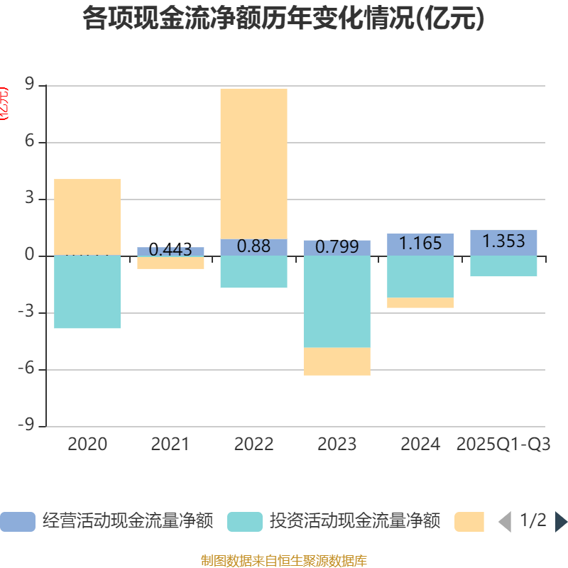 2025年前三季度,公司经营活动现金流净额为1.35亿元,同比增长114.15%;筹资活动现金流净额32.06万元,同比增加5186.68万元;投资活动现金流净额-1.09亿元,上年同期为-1.33亿元。