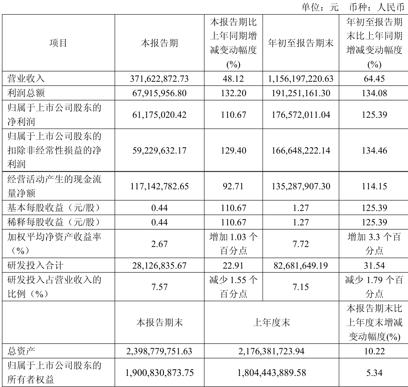 中证智能财讯鼎通科技(688668)10月21日披露2025年第三季度报告。前三季度公司实现营业总收入11.56亿元,同比增长64.45%;归母净利润1.77亿元,同比增长125.39%;扣非净利润1.67亿元,同比增长134.46%;经营活动产生的现金流量净额为1.35亿元,同比增长114.15%;报告期内,鼎通科技基本每股收益为1.27元,加权平均净资产收益率为7.72%。