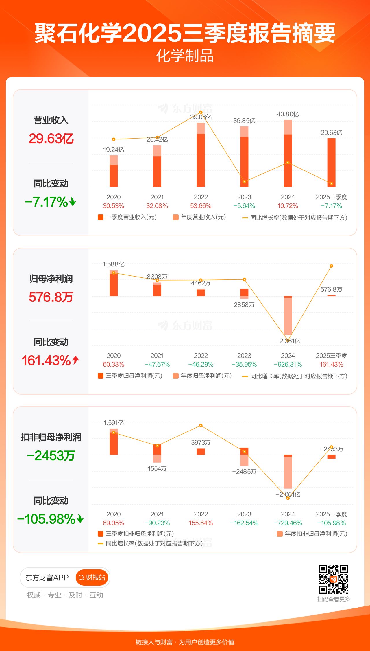 聚石化学10月29日发布2025年三季报显示,公司前三季实现营业收入29.63亿元,同比下滑7.17%;归母净利润576.84万元,同比增长161.43%;扣非归母净利润-2453.22万元。