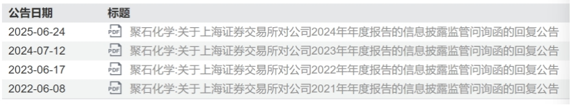 《科创板日报》记者注意到,聚石化学年报信披质量堪忧其实早有征兆。从2021年上市首年开始,公司2021年、2022年、2023年、2024年的年度报告均触发上交所信息披露监管问询,期间还针对2021至2023年的年报内容进行过更正操作。