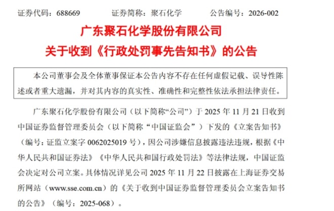 《科创板日报》记者注意到,早在2025年11月22日,聚石化学首次收到证监会《立案告知书》,案由为涉嫌信息披露违法违规。时隔近50天,如今调查尘埃落定,违法事实浮出水面。